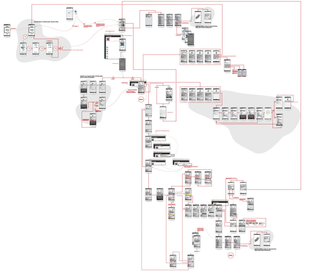 Upon project plan approval, I fleshed out a workflow map, detailing screen flows and per-screen content and behavior needs to be addressed. This map would also serve as our checklist and was updated daily with comments, new/revised direction, and iterated screens.